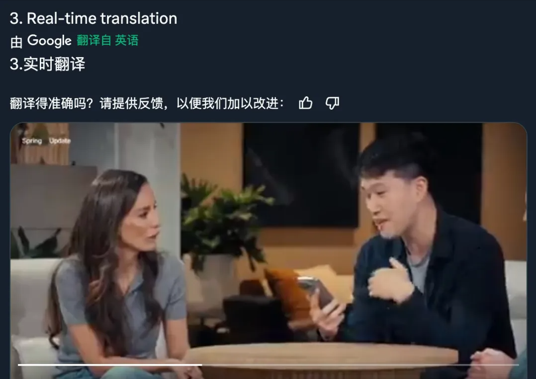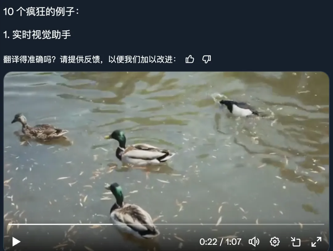 这个关于鸭子的演示,也很有意思,曾经谷歌也做过,但是后来大家发现谷歌是靠剪辑做的实时交互,GPT4o似乎可以通过摄像头直接实时交互。