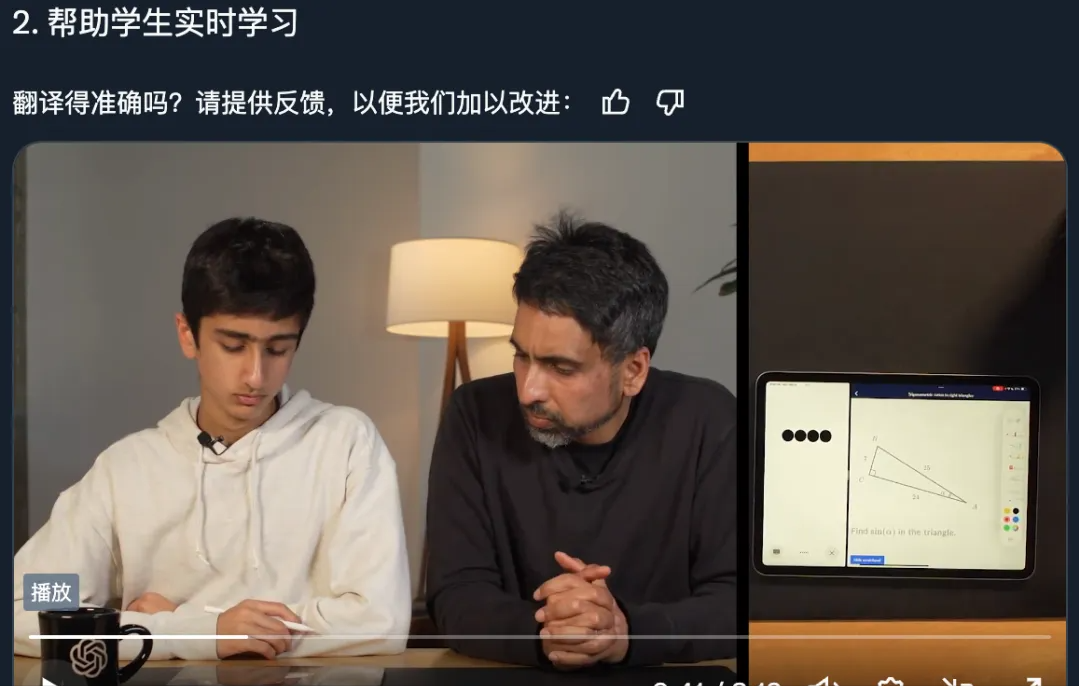视频演示了GPT4o直接读 IPAD中给出的题目,并可以和家长和孩子,通过语音实时互动。