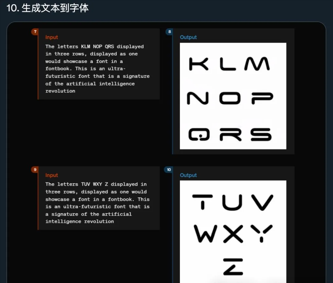 通过描述“字母 KLM NOP QRS 显示在三行中,像在字帖中展示字体一样。这是一种超未来的字体,是人工智能G命的标志” 来生成特殊字体。