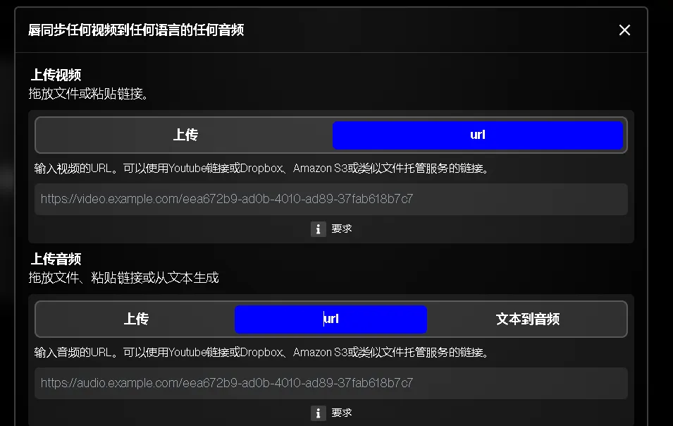 除了上传视频、音频合成外。你还可以选择视频链接(目前国内平台还不支持)或 Dropbox、Amazon S3 或类似文件托管服务的链接。