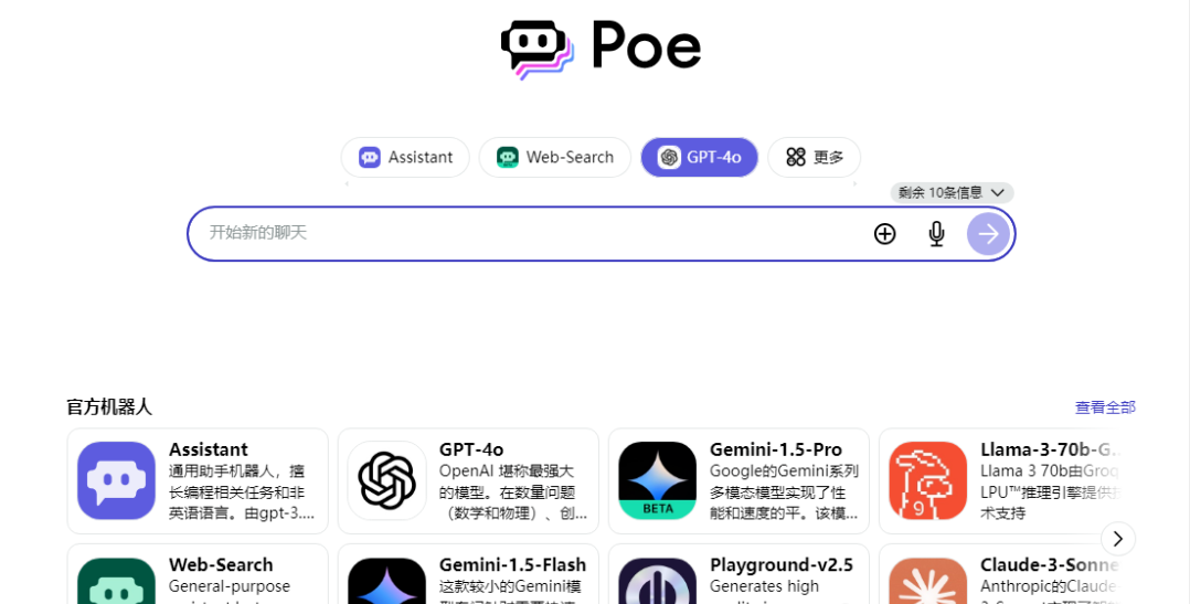 Poe 是免费体验GPT-4o模型的最佳方式之一。它提供了GPT-4o、Claude 3 和 Gemini 1.5 Flash等多个AI语言模型供免费用户使用。
