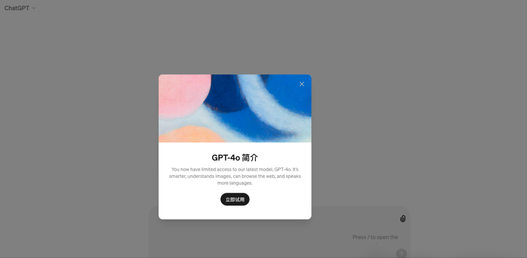 如果登录ChatGPT官网没有提示试用GPT-4o,可以在ChatGPT网址后添加?model=gpt-4o,然后按回车进行强制切换。