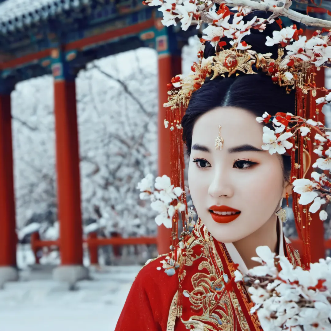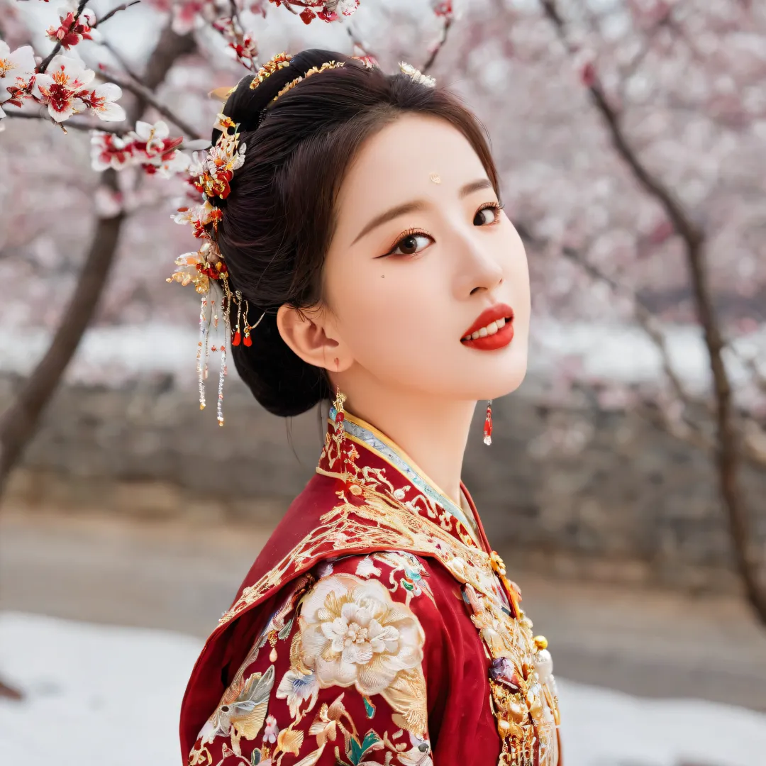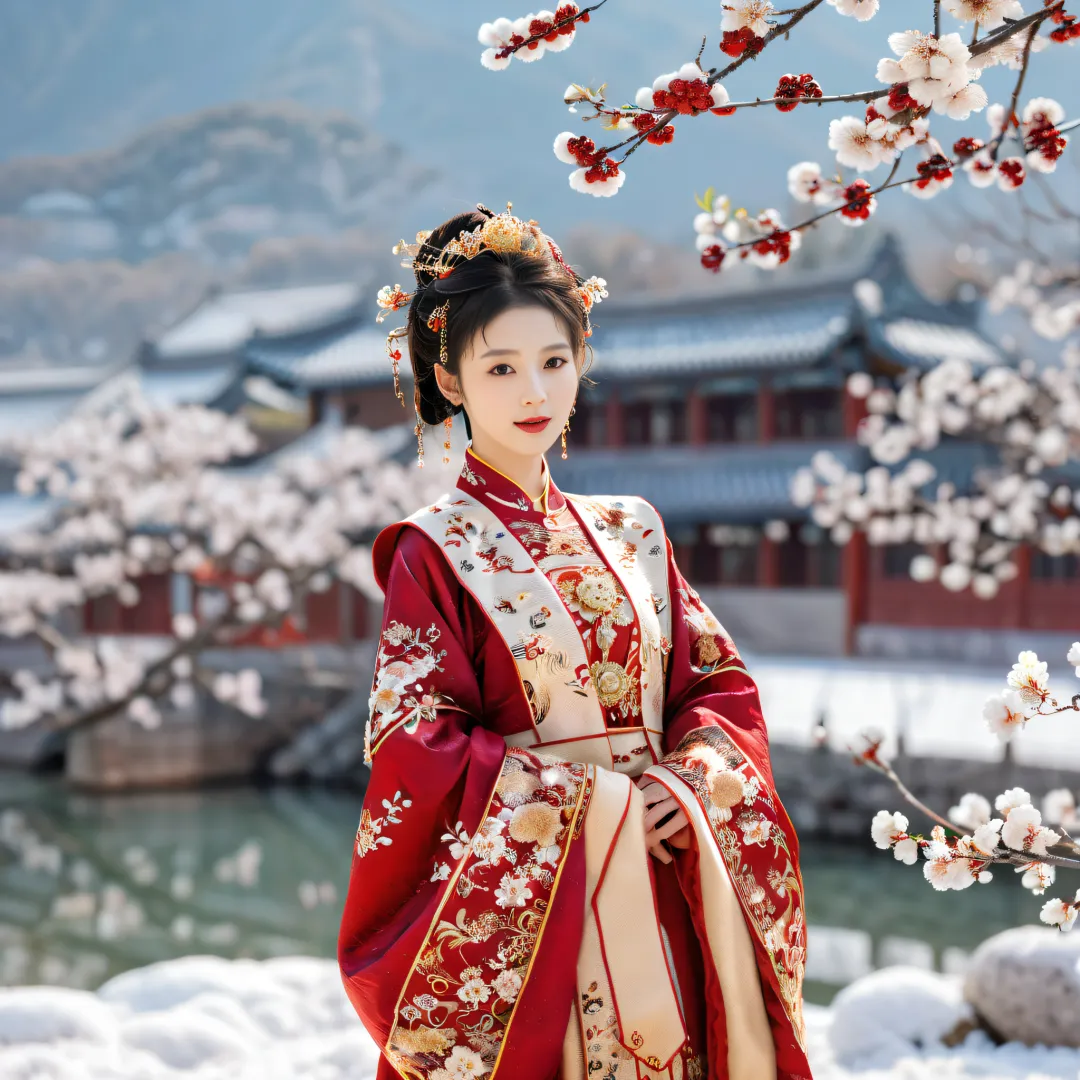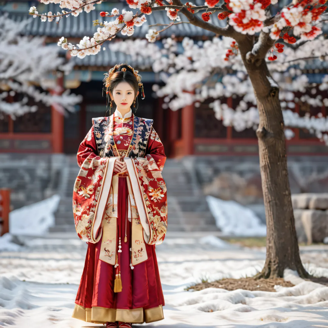 QIEMANCN,a photo of woman with a red and gold dress,hanfu,chinese style,grand spectacle,wide viewing angle,high definition,big scene,snowscape,plum blossom,looking at the camera,