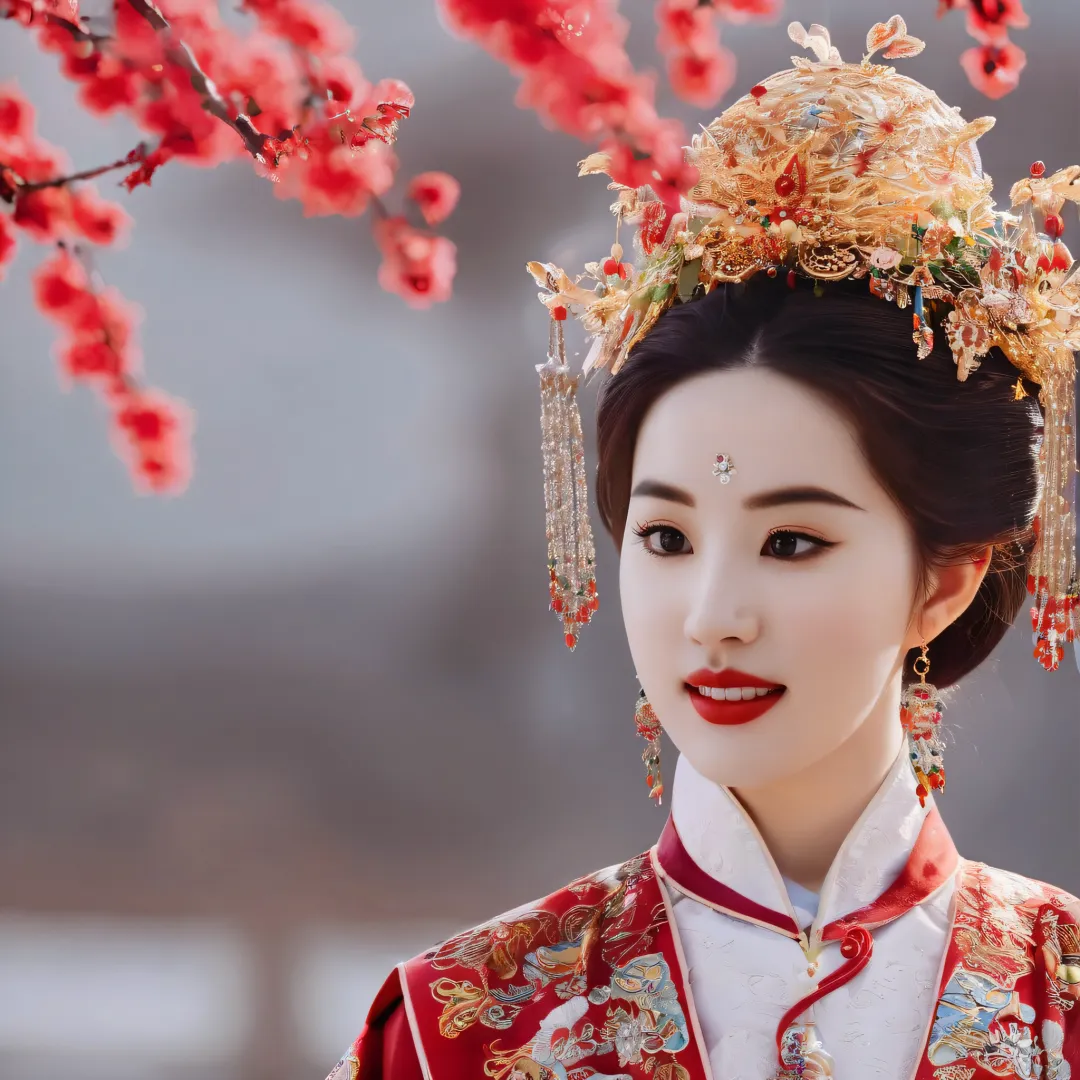 QIEMANCN,a photo of woman with a red and gold dress,hanfu,chinese style,grand spectacle,wide viewing angle,high definition,big scene,snowscape,plum blossom,looking at the camera,<lora:国风 | 汉服 | 凤冠霞帔 SDXL_v1 XL:0.6>,