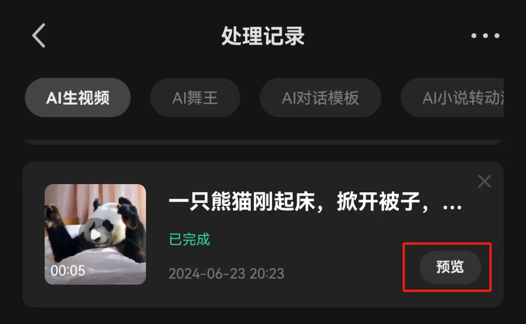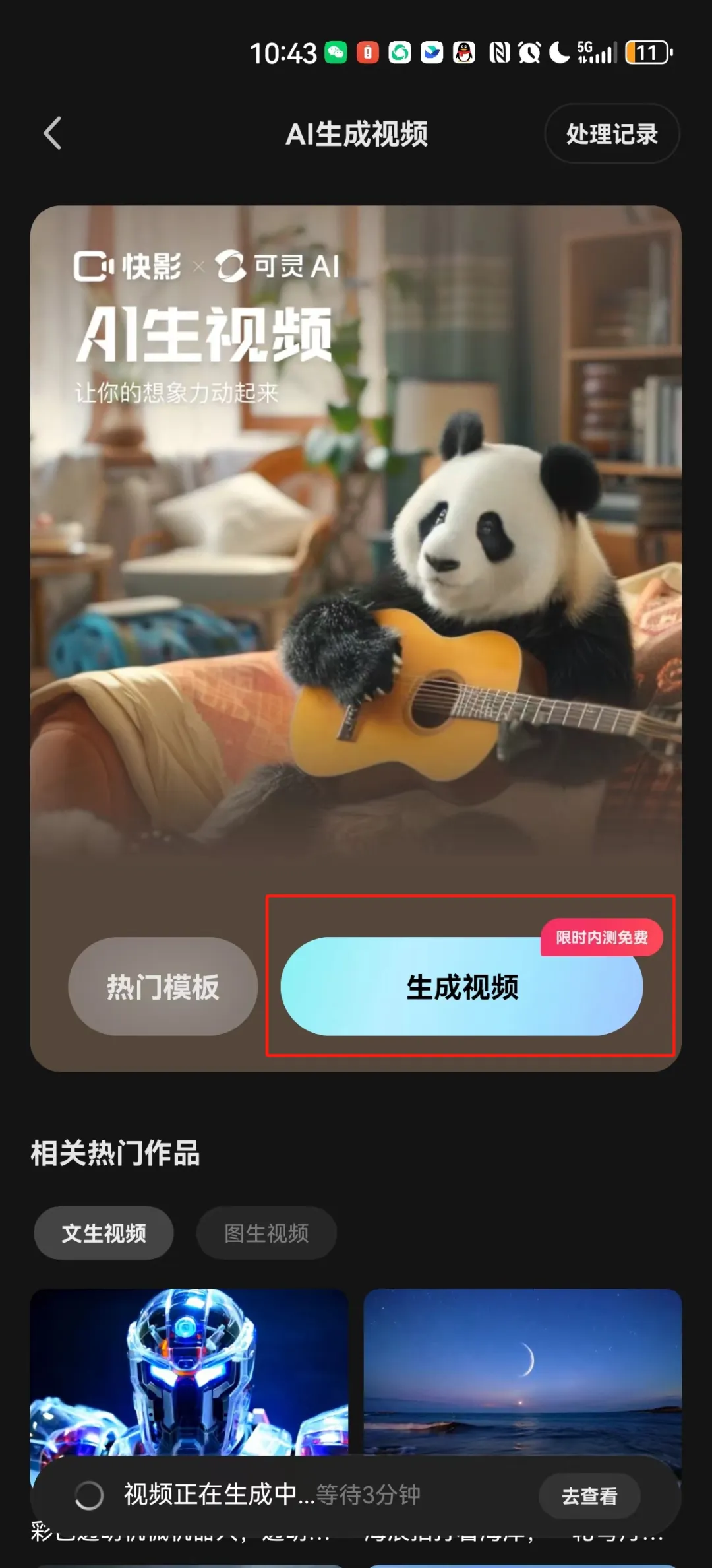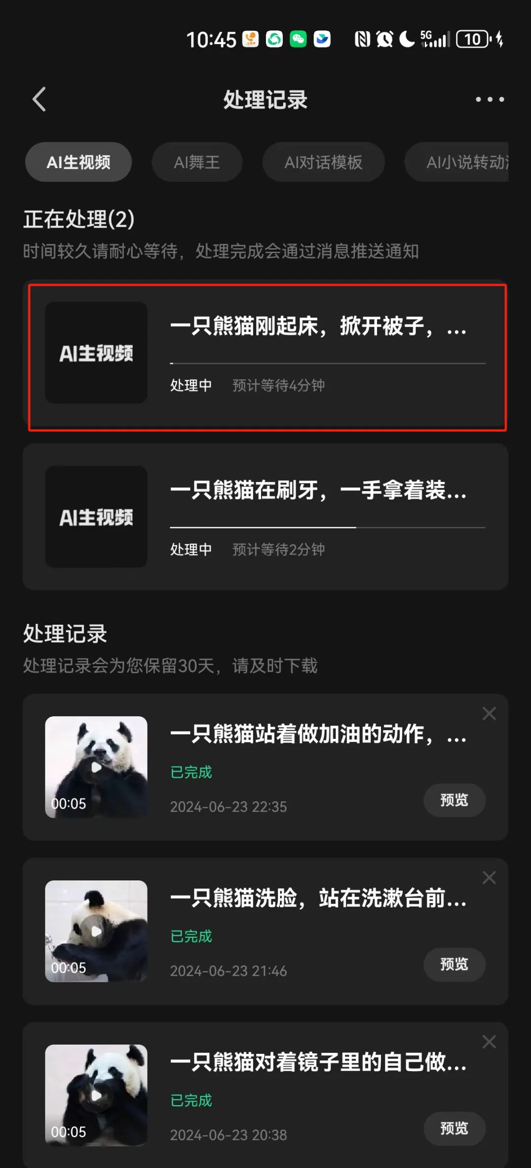 跳转到处理记录界面,可以看到刚才咱们生成的视频正在处理,预计等待4分钟。