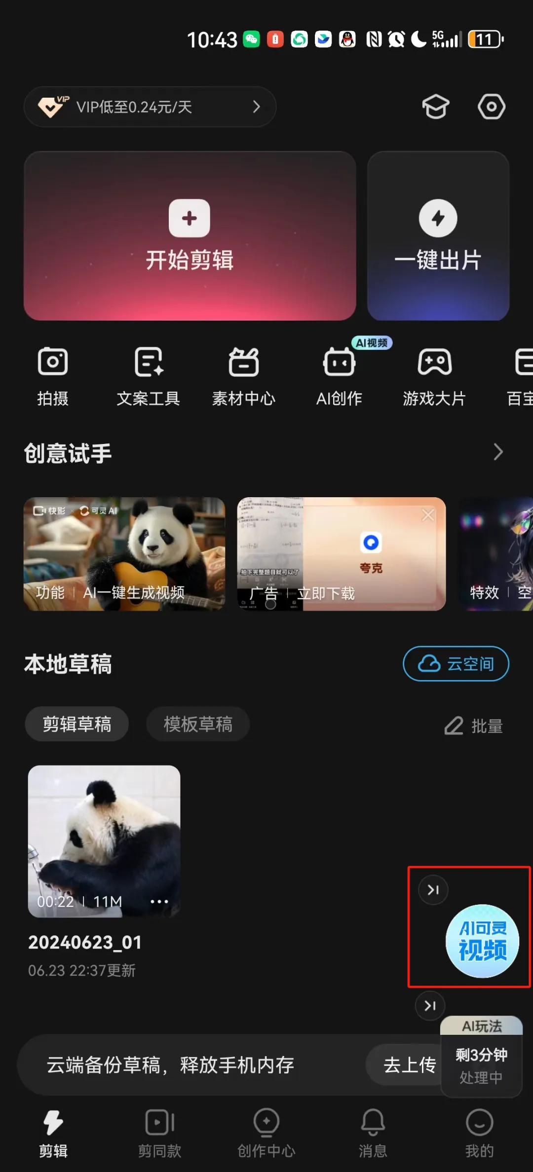 进入快影App【剪辑】界面,点击右边浮动图标【AI可灵视频】。