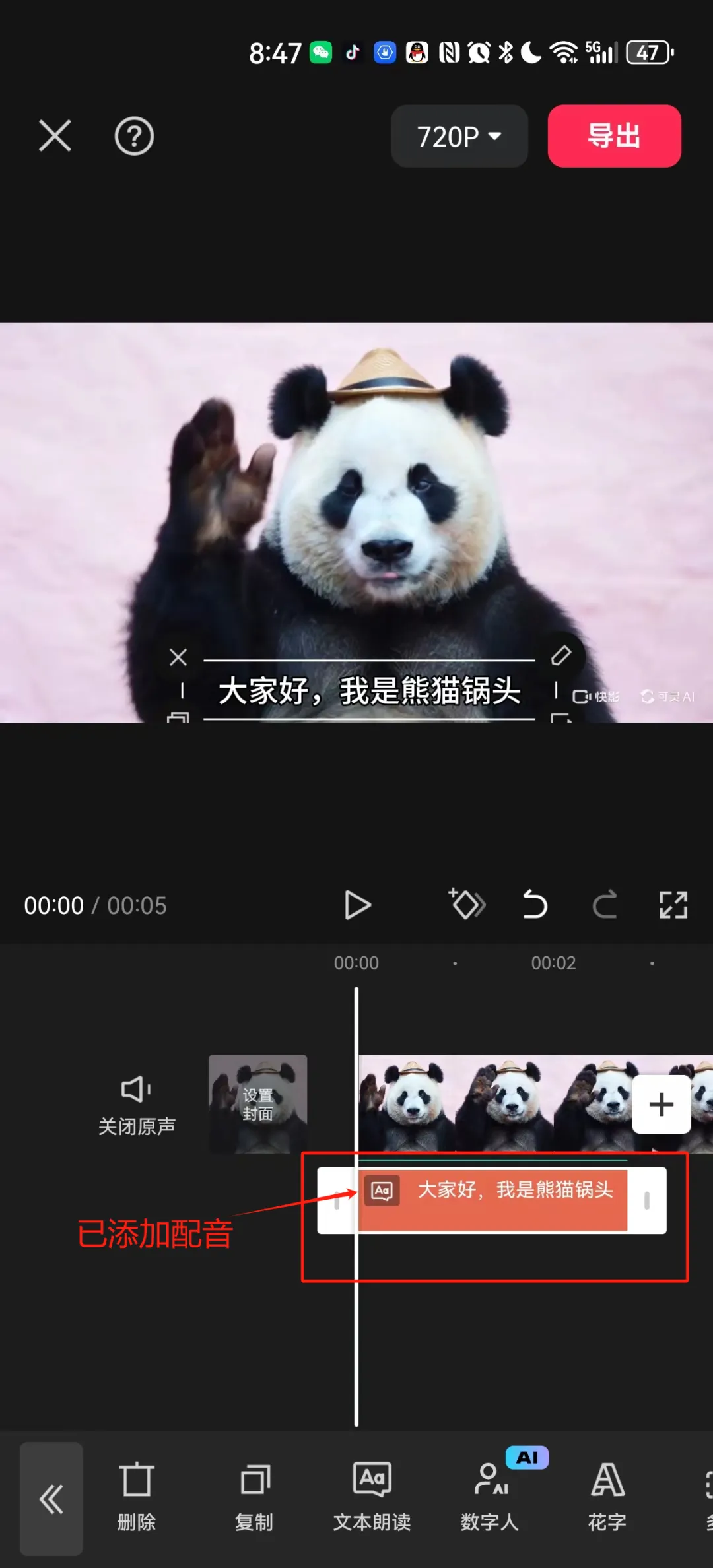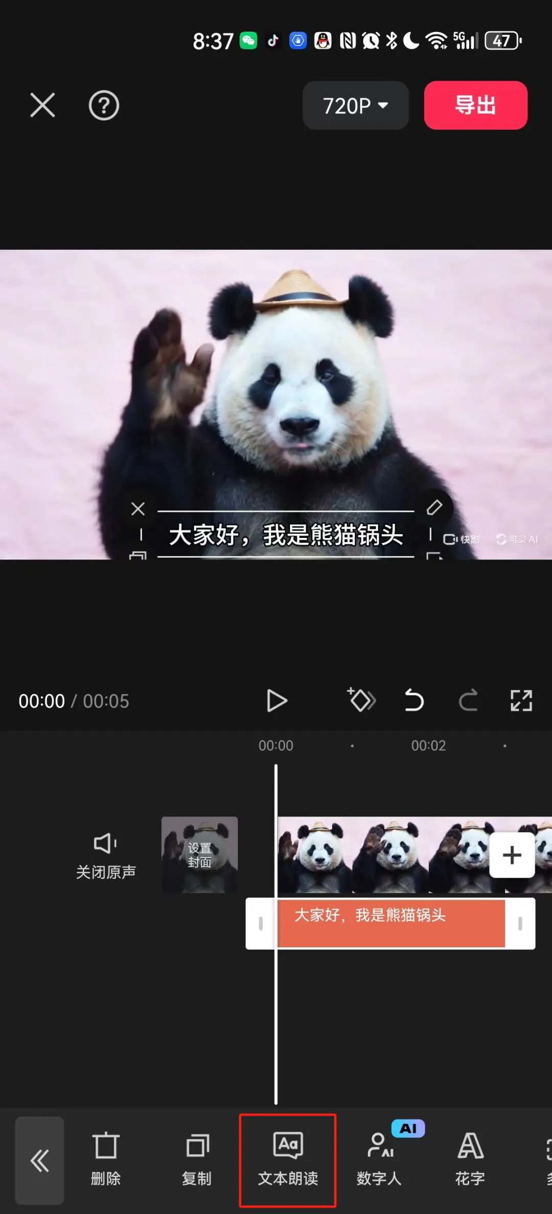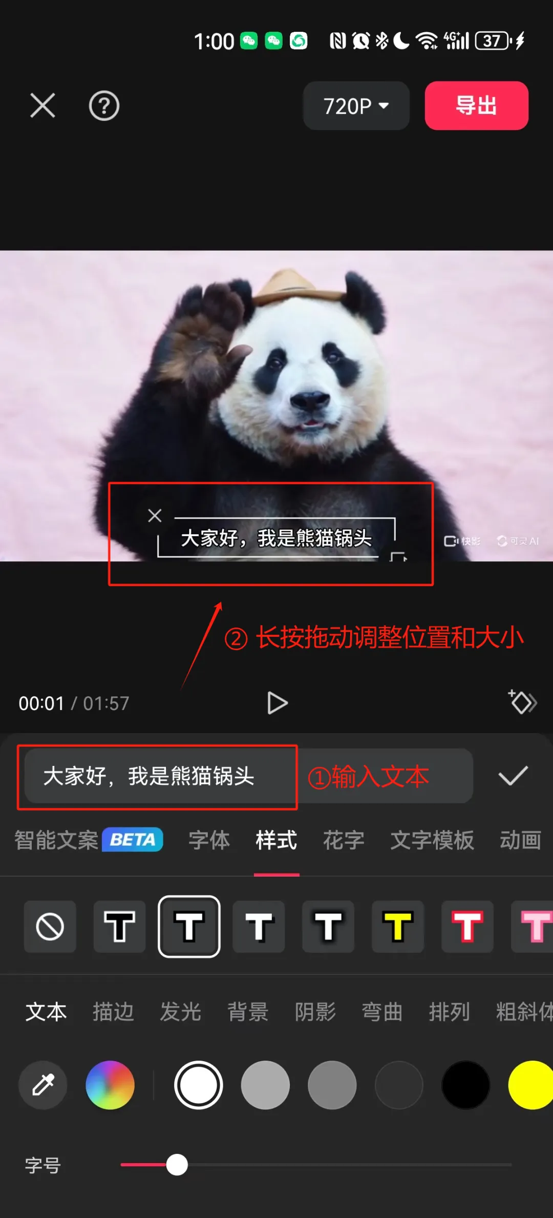 输入文本(例如:大家好,我是熊猫锅头),然后长按文本可以拖动调整位置,双指操作可以放大缩小。