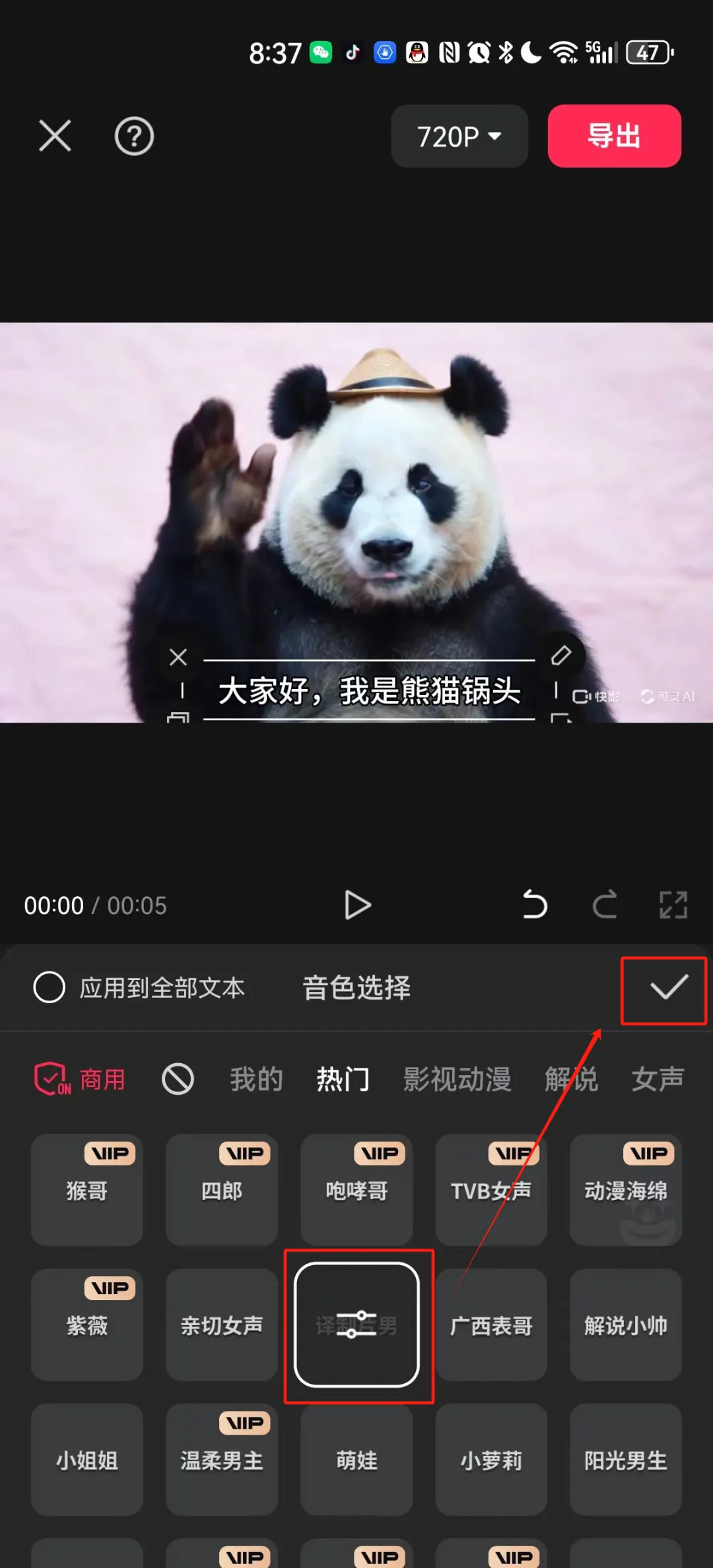 进入音色选择界面,锅头在这里选择了译制片男的配音,点击音色选择右边的【√】。