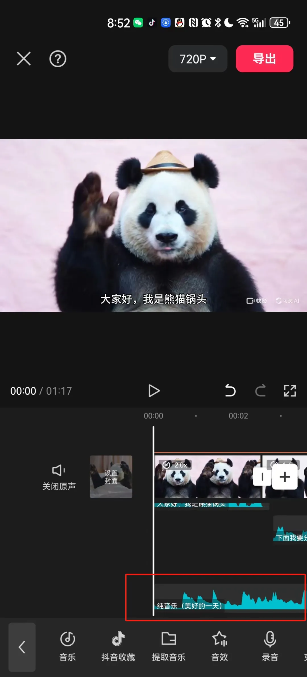 按“熊猫锅头的一天”故事时间顺序,选择刚才用可灵生成的熊猫视频片段后,点击【添加】。