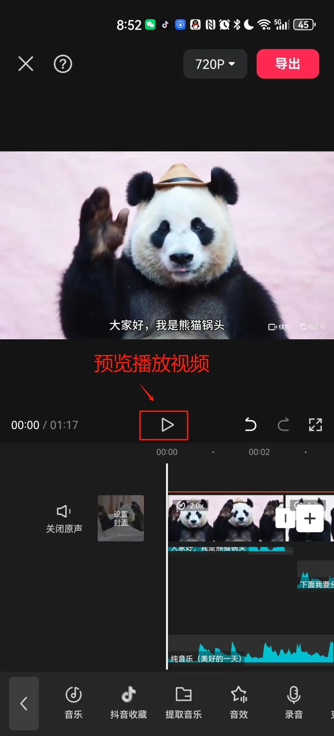 这时候,咱们可以点击中间【播放】图标,预览播放视频效果。
