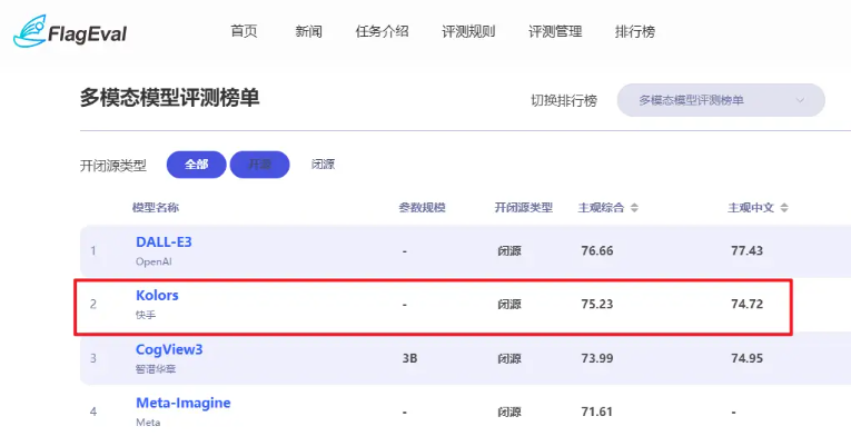 Kolors以其强大的复杂语义理解能力和摄影级的画质质感,赢得了开发者和用户的高度评价。在智源FlagEval文生图模型评测中,Kolors以75. 23 分的主观综合评分排名全球第二,尤其在图像质量方面表现突出,评分排名第一。