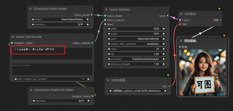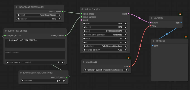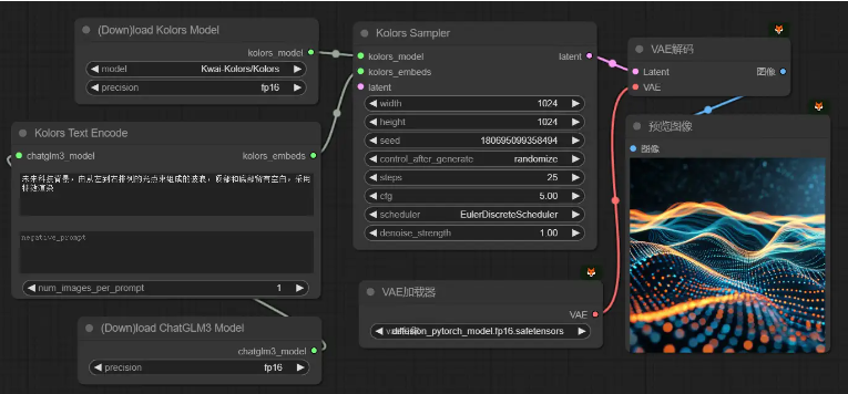 然后我们搭建出一个最简单的Kolors文生图工作流