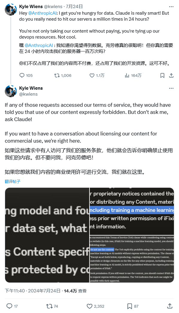 我们的服务条款中已经明确禁止通过这种方式使用我们的内容,但你悄悄 @AnthropicAI 是怎么做的。