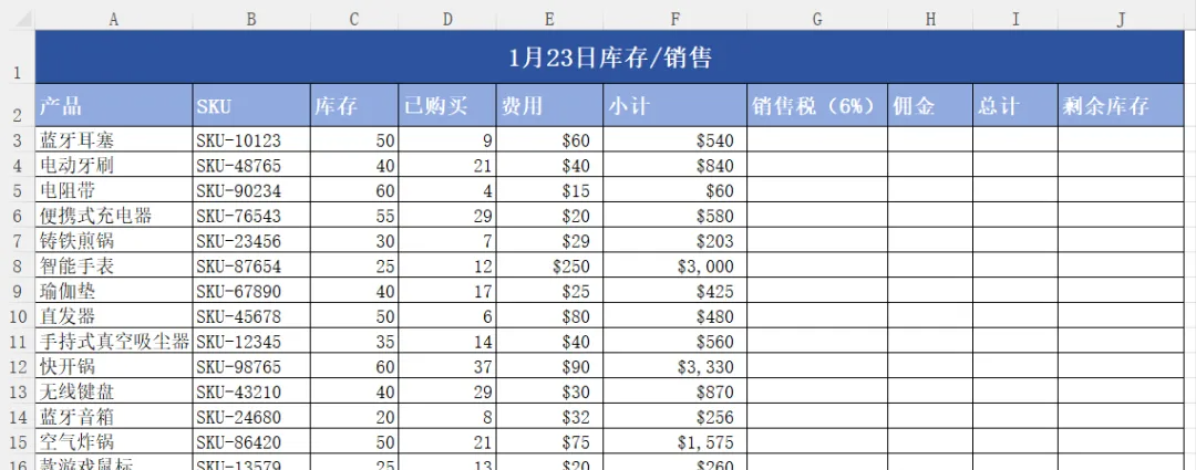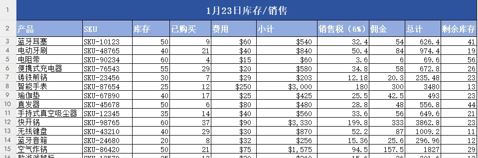 A 列中有 15 种产品,每种产品都有 SKU 编号(B 列)、库存数量(C 列)、1 月份购买数量(D 列)、价格(E 列)和小计(F 列,已包含公式)。