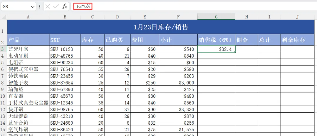 在下面的示例中,我调整了公式,正确地使用 G3 这个单元格的数据来计算销售税。