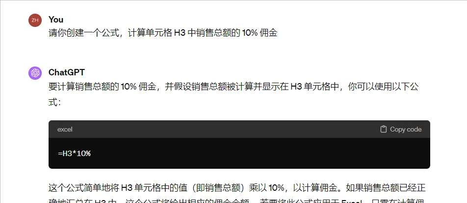 我将在电子表格中继续添加所需的公式,现在开始计算佣金,我要求 ChatGPT “请你创建一个公式,计算单元格 H3 中销售总额的 10% 佣金”。