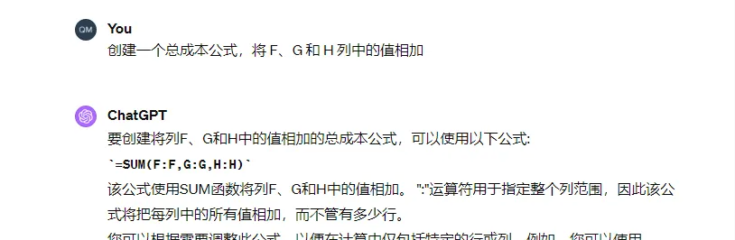 我没有指定公式要从 G 列的哪一行开始,所以 ChatGPT 自动使用 G2。