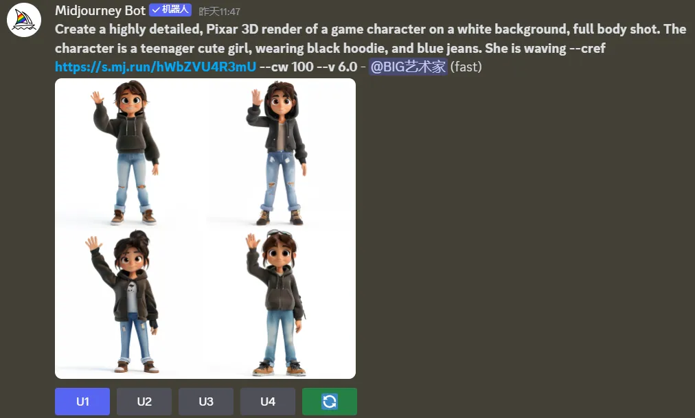- 图④,我没有使用【–cw】,Midjourney会默认为【–cw 100】,即人物的脸部、头发和衣服保持一致,仅根据我新给的提示词【is waving (在招手)】来做动作上的改动。