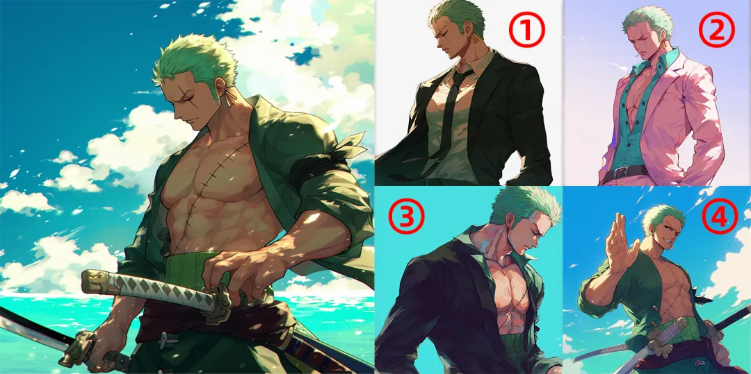 动漫风格图片的一致性,我个人认为是非常好的,先给大家看看我做的索隆