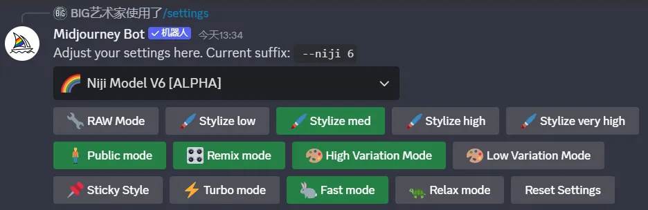 需要注意的是,在使用MJ做动漫风格图片时,需要先设置成Niji模式