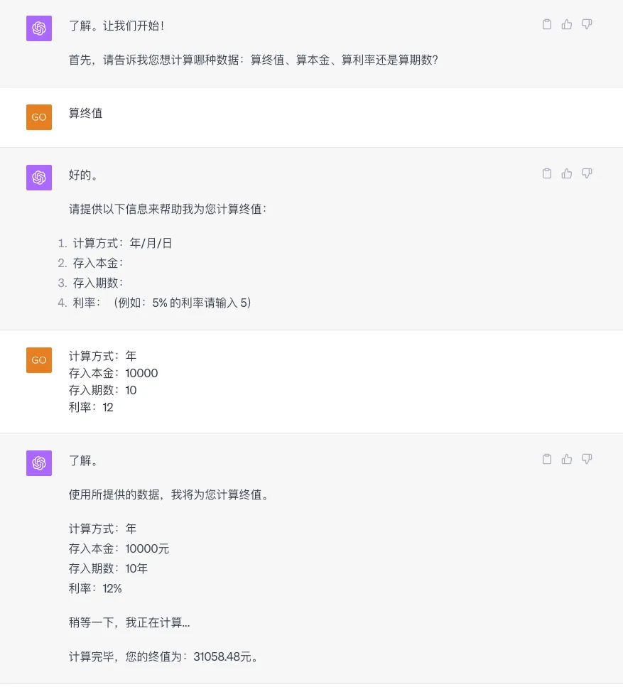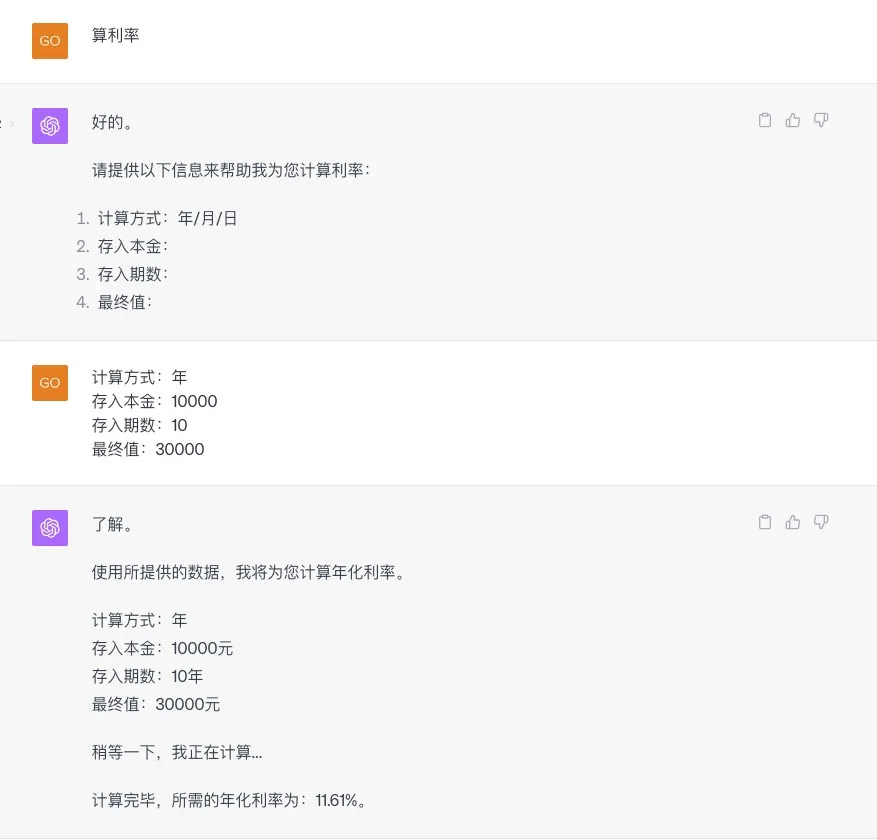使用ChatGPT,就不需要在网上找其他的复利计算器了。可以算终值、算本金、算利率和算期数。