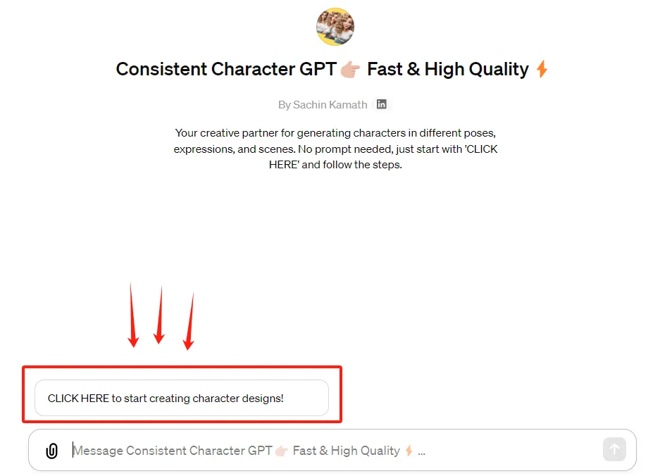 点击进入GPT操作界面后,点击“Click here to start creating character designs”