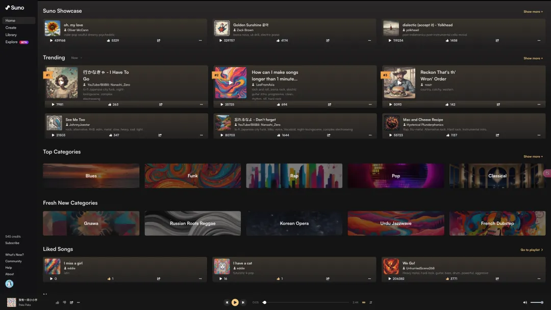 Suno是目前最火的AI音乐创作平台,一句话就可以创作一首歌。但因为其并未专门针对中国市场做本地化,目前只有英文版。
