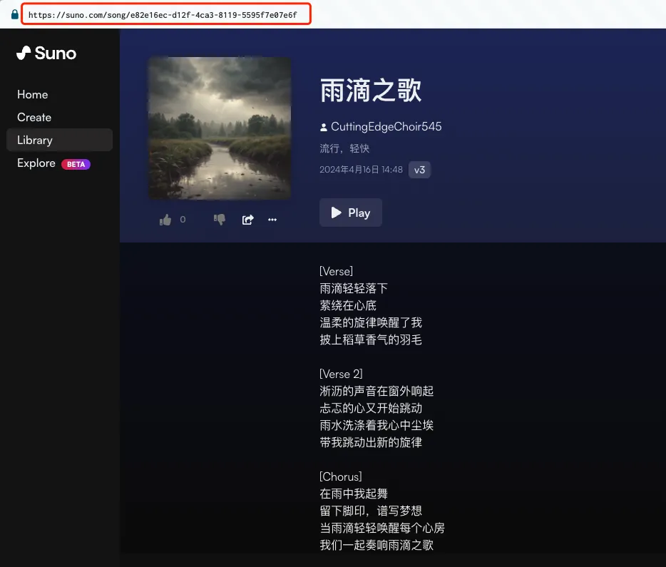 于是我把这串编码替换到suno官方歌曲详情页的网址中: