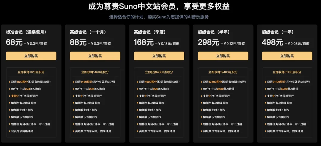 Suno官方注册用户每天免费10首,如果不够用,标准订阅计划10美元可生成500首歌,折合下来每首歌只需要0.09元。