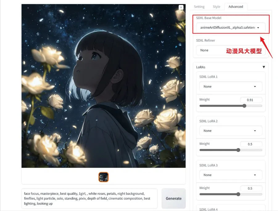 Simply enter the prompt word in the text box and click the "Generate" button to generate the image. Check "Advanced" for more advanced settings. The generated image will be automatically saved in the outputs folder in the root directory.