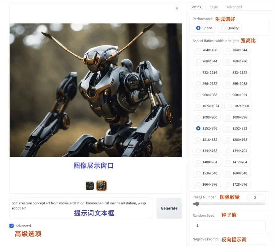 After the download is complete, the drawing interface will automatically open. The default mode is simple mode, with only an input box, a generate image area and a generate button. Its basic interface is very simple. Checking "Advanced" will pop up an advanced settings window, where you can adjust the aspect ratio, style, number of images, seed value, reverse prompt word, model, lora weight ratio, image sharpness, etc.