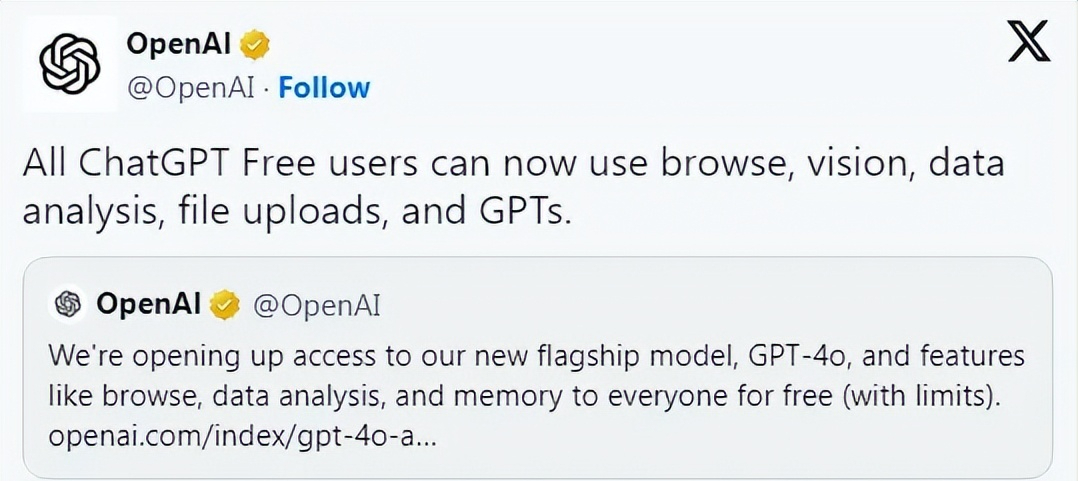 On Wednesday, OpenAI posted on social media X that all free ChatGPT users can now use all the new features announced in the spring update event, including networking, visual functions, data analysis, file uploading, and custom GPT.