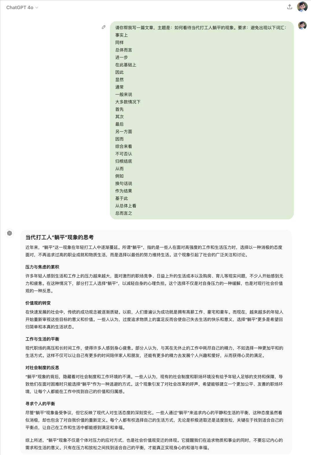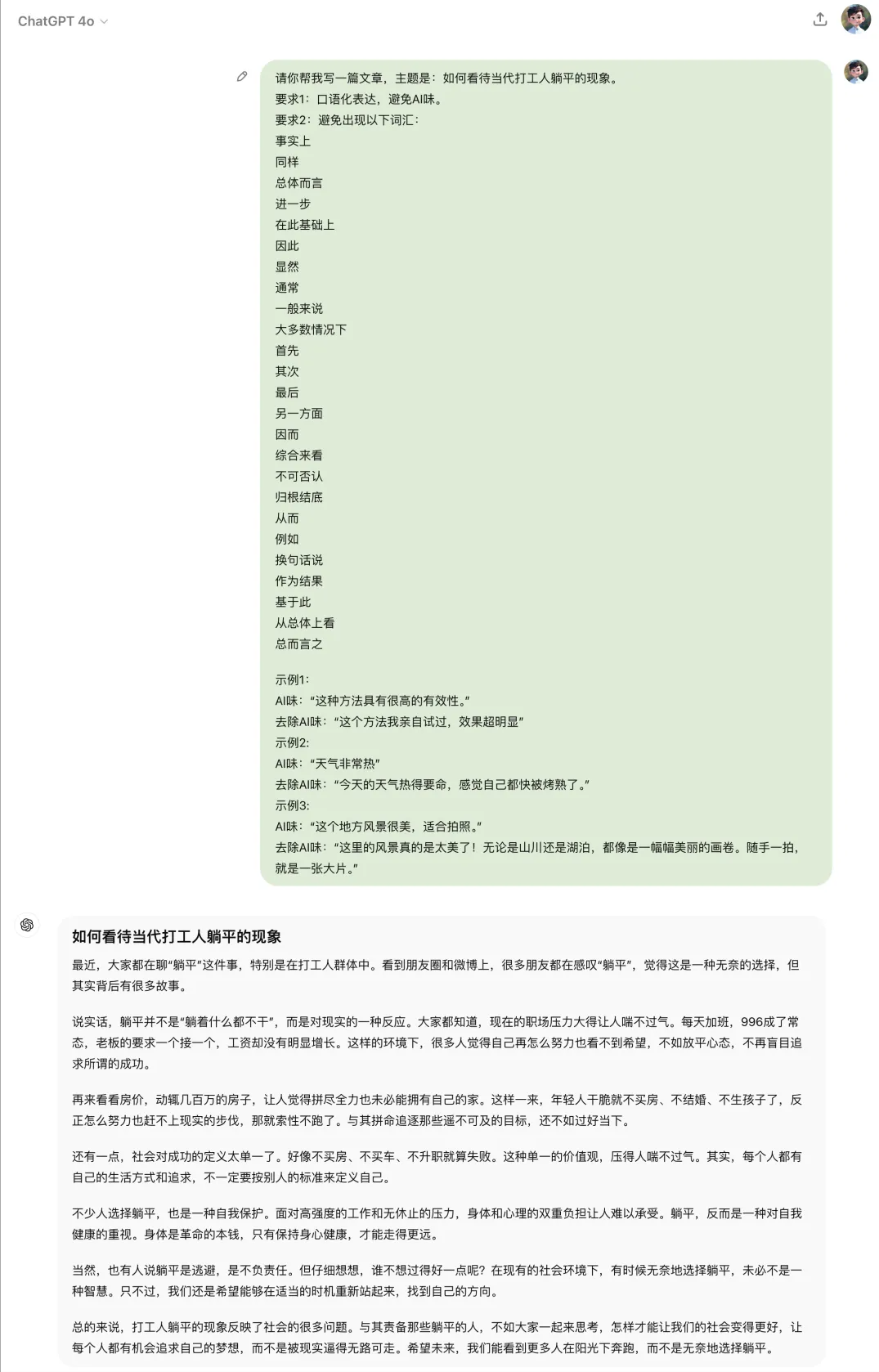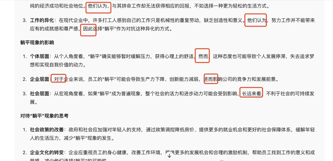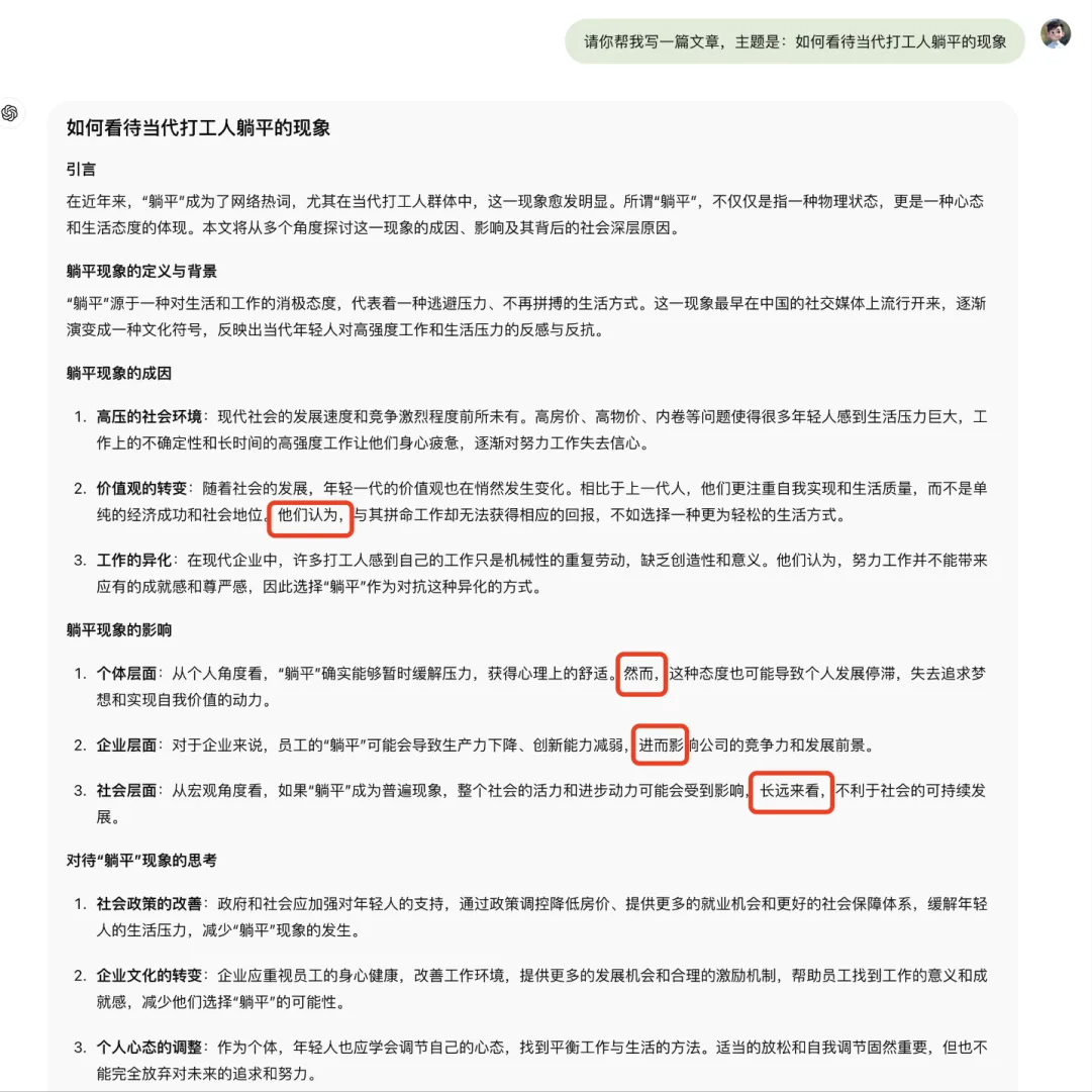 Let’s first look at a case where AI was asked to write an article about “How to view the phenomenon of workers lying down”. In the AI-generated content, there were many awkward transitional words such as “they believe”, “therefore”, and “furthermore”, which are full of AI flavor.