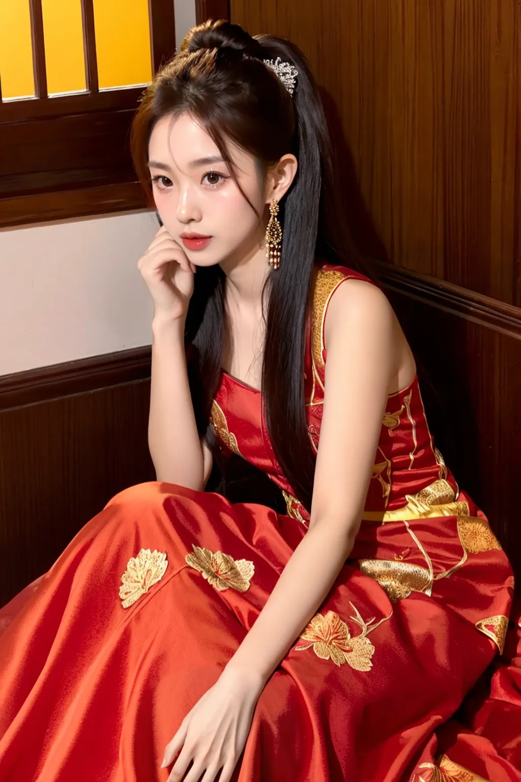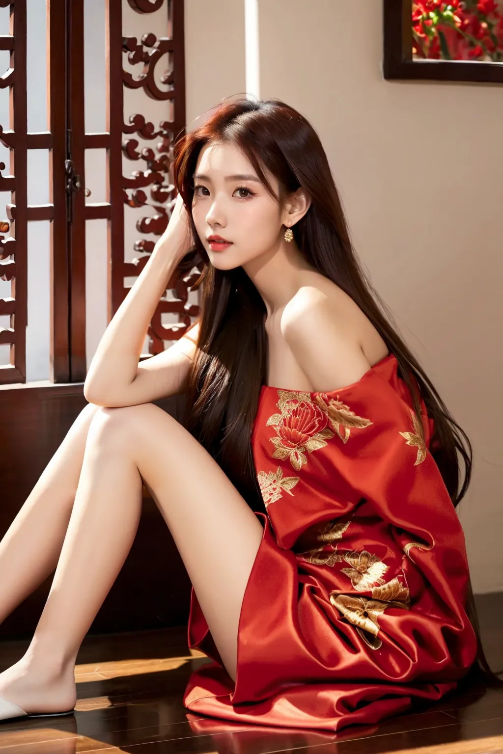 1girl,dress,hair ornament,red dress,solo,chinese clothes,long hair,sitting,bare shoulders,window,brown hair,hair bun,indoors,black hair,looking at viewer, ,