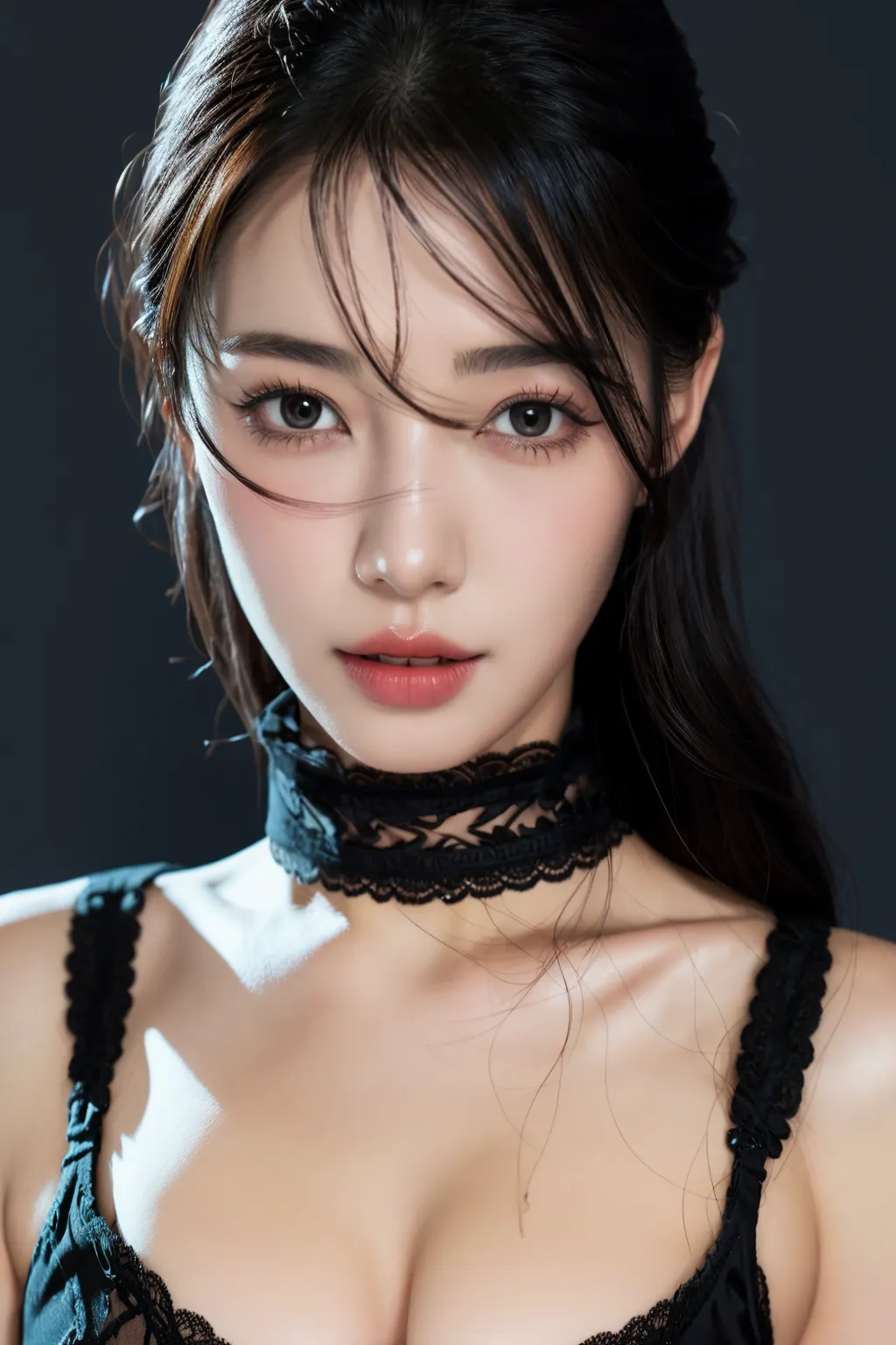 1girl,portrait,looking at viewer,blur background,high necked lace top,black lace,simple background,frontlight,side light,