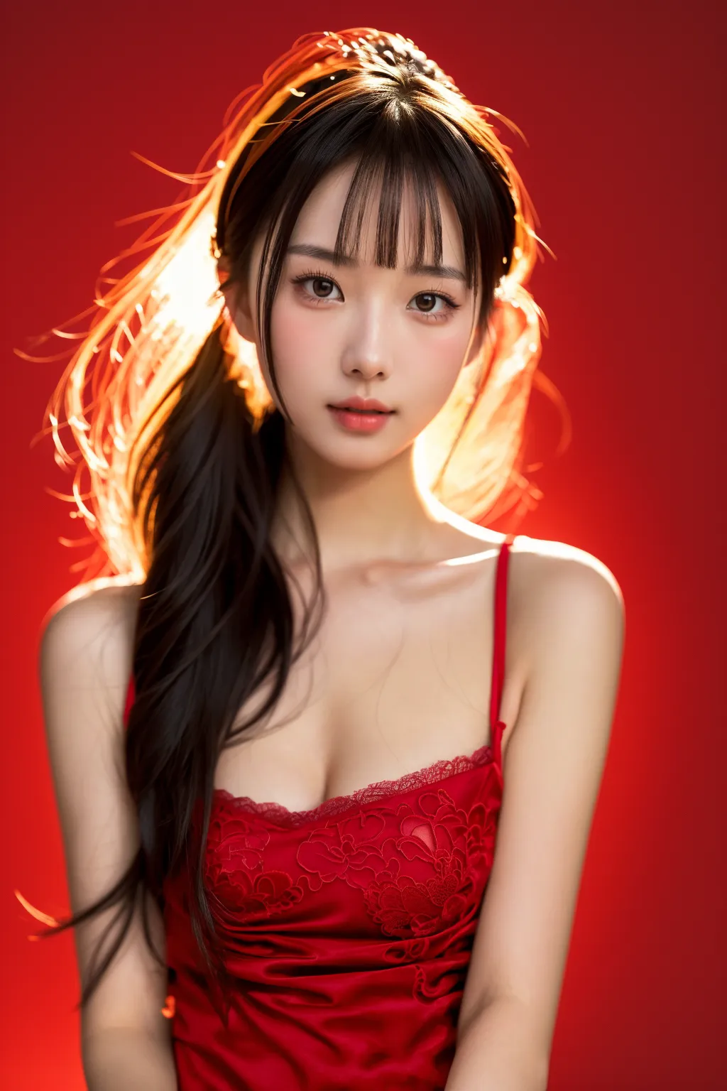 chinese girl, 1 super beautiful fashion model,high necked lace top,looking at viewer,upper body,simple background,red background,front light,side light,sfw,film photography,photo realistic,insanely detailed,best quality,ultra-detailed ,masterpiece,highres,details,