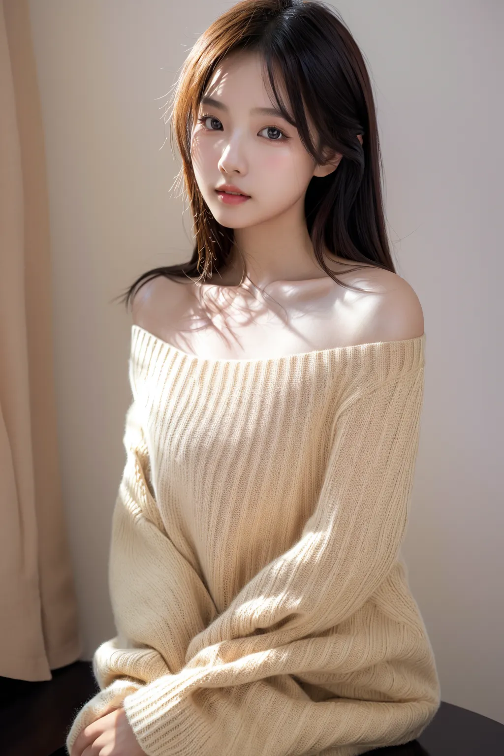 chinese girl,1girl,off shoulder sweater,glamor,looking at viewer,simple background,front light,side light,sfw,film photography,photo realistic,insanely detailed,best quality,ultra-detailed,masterpiece,highres,details,