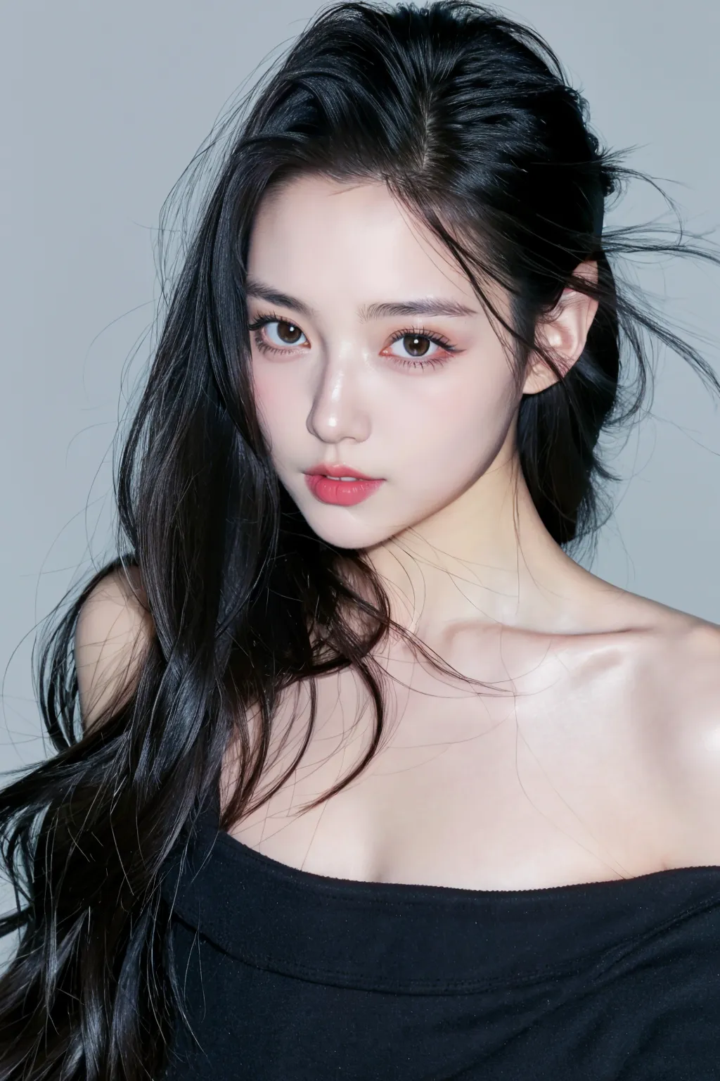 close-up,1girl, solo, black hair, long hair, realistic, looking at viewer, simple background, gray background, parted lips, bare shoulders, lips, black eyes, upper body, off shoulder,