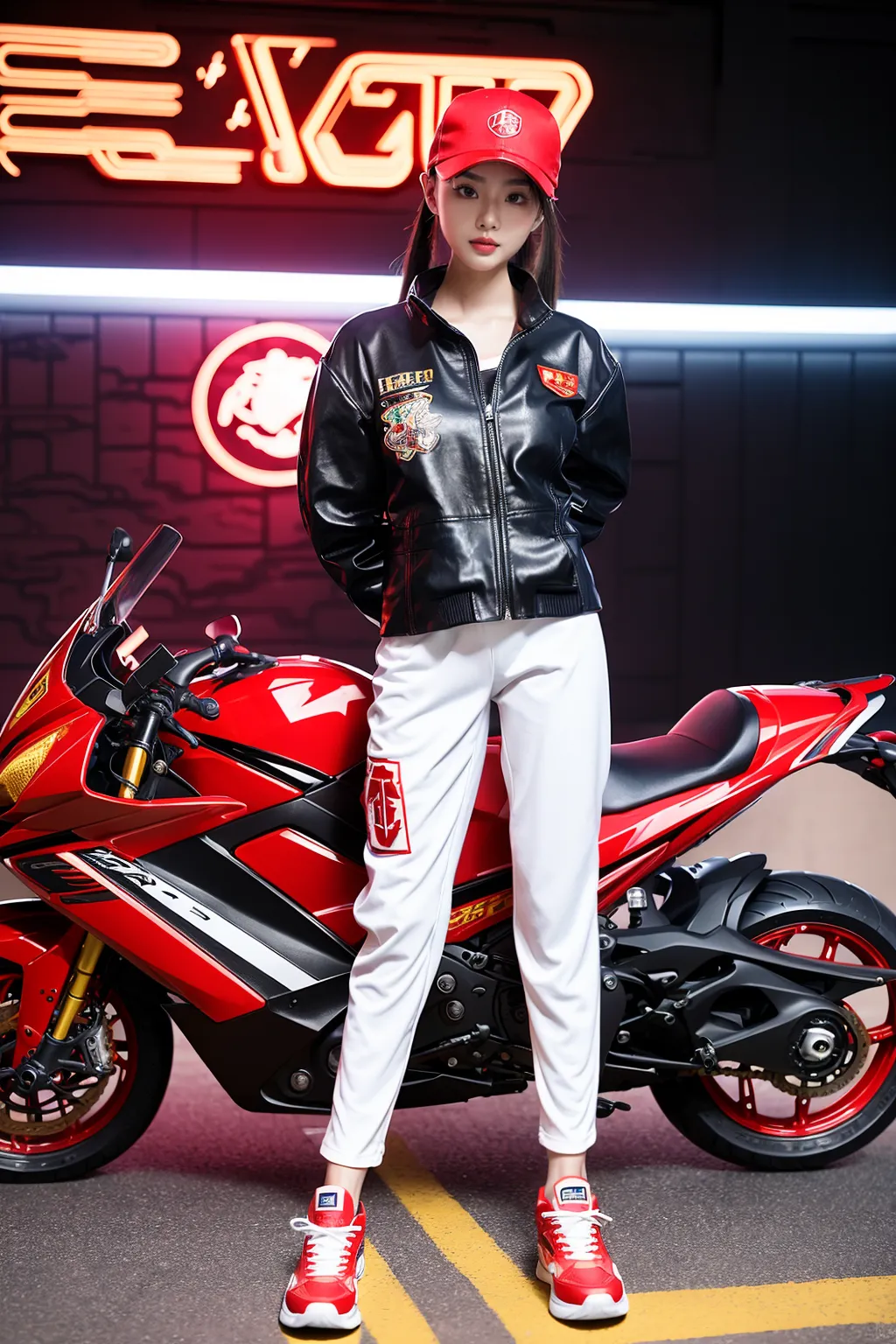 chinese girl,1girl,super beautiful,18-old-years,futuristic science fiction,red motorcycle,Motorcycle clothing,cargo pants,jackets,Leather pants,high-top sneakers,snapback hats,bold patterns,details,best quality,