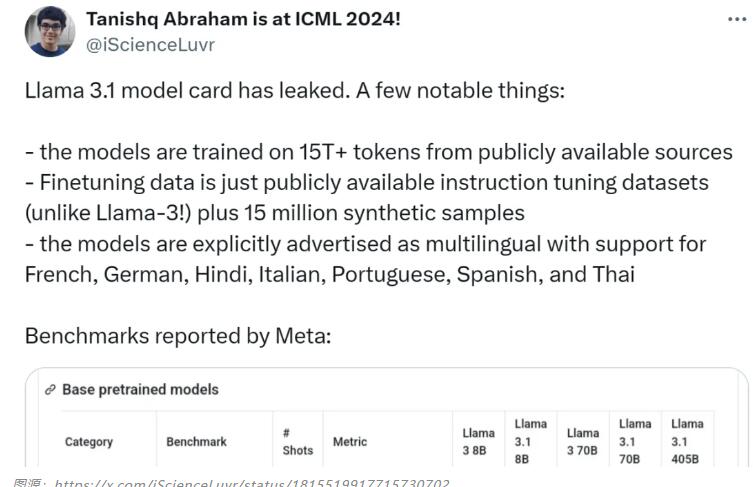 Llama3.1 is composed ofMetaDeveloped by (formerly Facebook)Large Language ModelsAlthough it has not been officially released yet, the leaked version has already caused a stir in the community. This model not only includes the base model, but also the benchmark results of 8B, 70B and the maximum parameter 405B.
