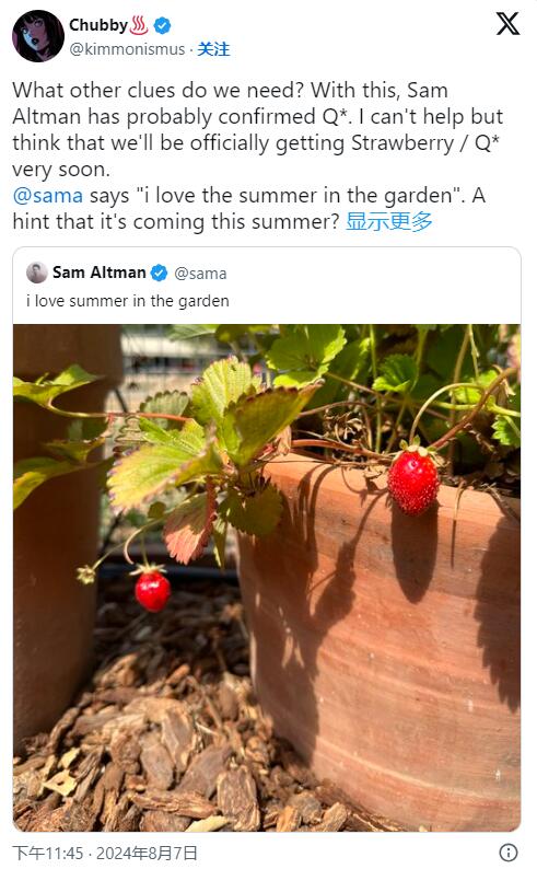 Although the photo may seem ordinary, members of the AI community believe that this may be Altman hinting at a new base model that OpenAI is developing, internally codenamed "Strawberry". This model is believed to be related to the highly anticipatedGPT-5Quite. A blogger on X, @kimmonismus, posted: "What more clues do we need? This could be confirmation of Q*."