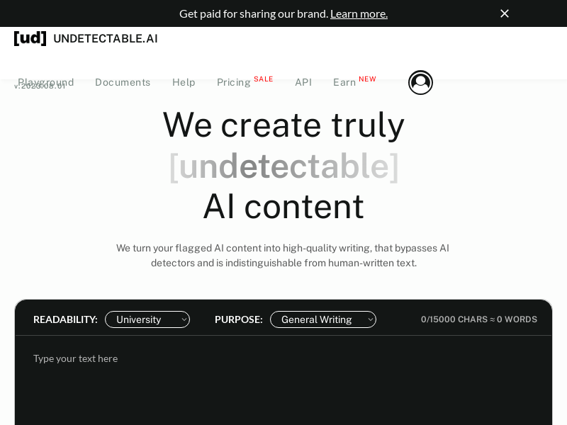 Undetectable.ai Sign up and login toFree TrialNew users receive 250 credits and free access to AI detection. For more benefits and credits you can buy a membership or buy by the word.