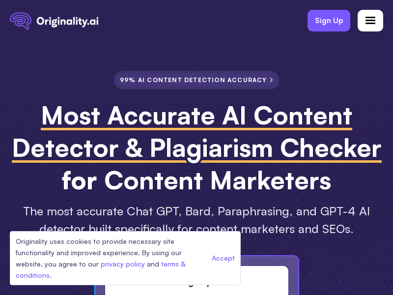 Originality.ai SupportFree TrialUsers can check the results by conducting a simple trial directly on the corresponding function page of the website, and can use AI content detection 3 times, AI plagiarism detection 10 times, AI fact checking 3 times, and AI readability detection free of charge.