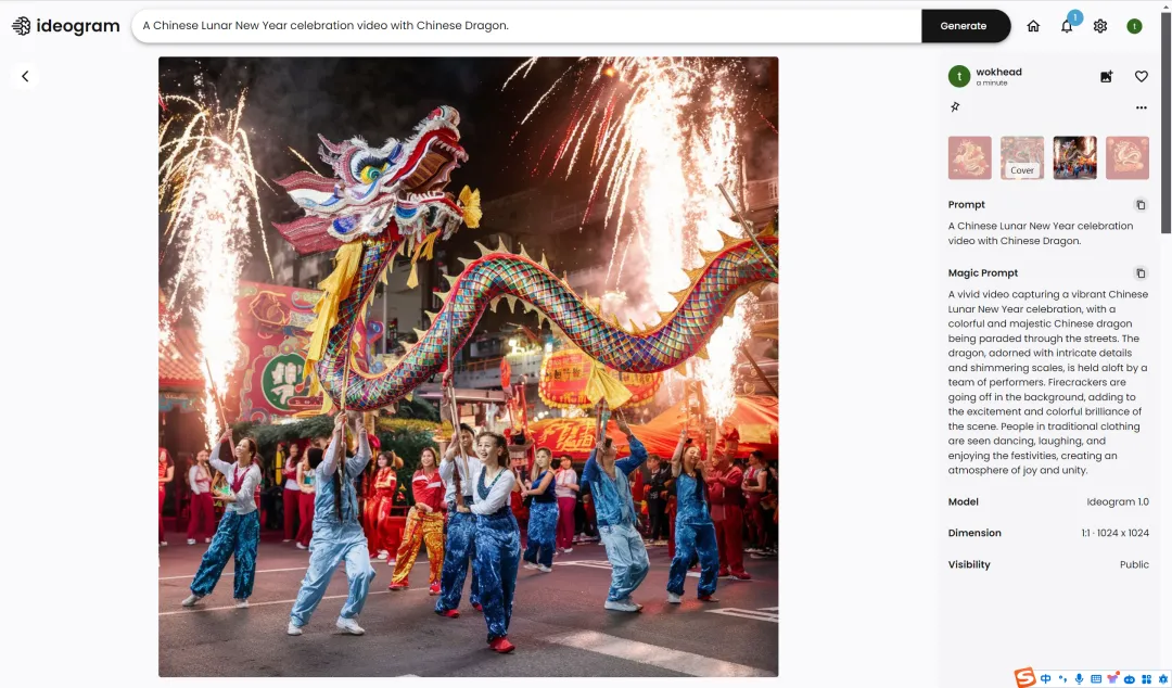 - Enter the image prompt you want to generate in the text box, select Magic Prompt (whether to use magic prompt), Ratio (size), Model (model), Visibility (visible range) settings, and click [Generate] to generate the image.