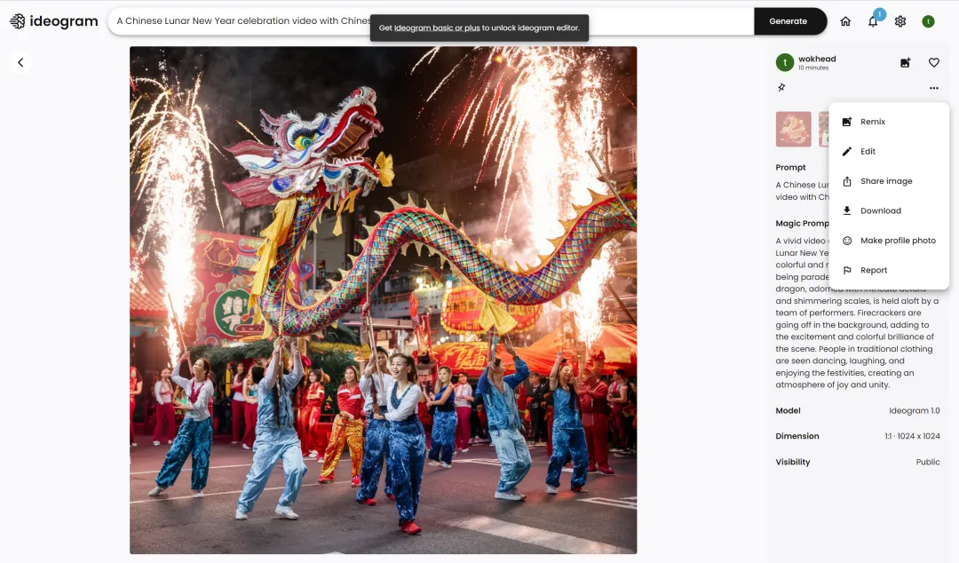 - When you click [Edit] to edit, you will be prompted to "Get Ideogram basic or plus to unlock ideogram editor." (PS: You need to upgrade your account to basic or plus to unlock editor permissions)