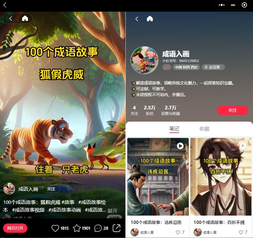 其实,在小红书平台上,还有很多同类账号用AI还原成语故事场景图画的账号,都能轻松吸粉1W+,比如下图的的两个账号都是这种做法。