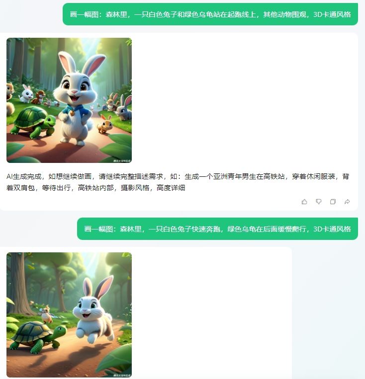 - 这里要强调的是,为了保证角色比较统一的风格,最好每个提示词都固定动物的形象以及风格类型,比如小编在提示词中就一直要求是白色兔子和绿色乌龟,并且要求3D卡通风格。生成效果如下: