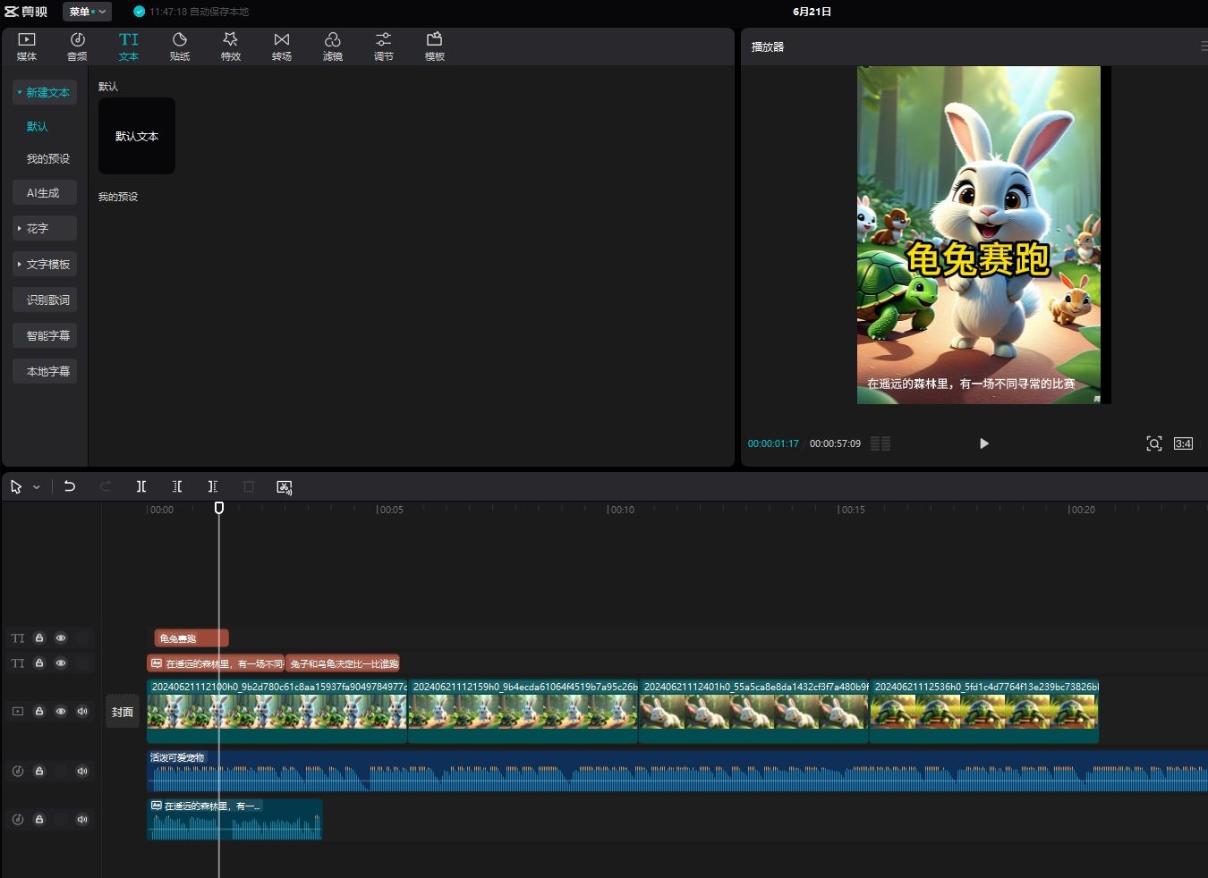 - 输入指令词之后,接着再输入龟兔赛跑的成语故事文案,就能生成分镜了。生成结果如下:
