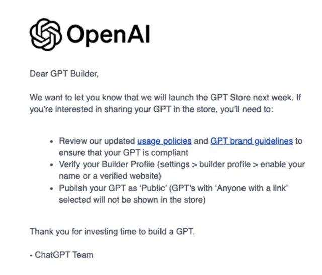 美东时间1月5日,美国OpenAI公司向所有自定义GPT开发者发布了一封邮件备忘录,显示OpenAI 计划下周推出“GPT Store”商店。该商店将允许 AI 模型开发商以不同目的和形式演变成定制化OpenAI聊天机器人,如为中学教师设计课程等。
