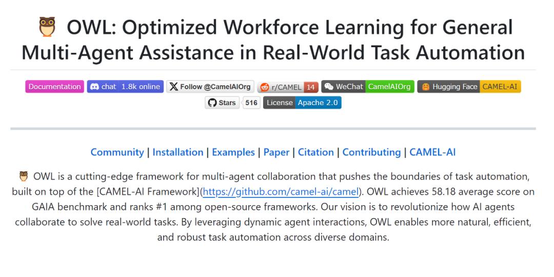 他们的 Manus 开源复刻版名叫「OWL」,在 GAIA Benchmark 上性能达到 57.7%,超越了 Huggingface 提出的 Open Deep Research 55.15% 的表现,成为开源界 GAIA 性能天花板。(GAIA 是一个用于评估通用人工智能助手能力的基准测试,Manus 也做了相关测试。)